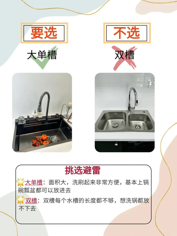 下水设计选靠边,不选居中下水靠边的设计,能让水槽下方的空间得到更充分利用,方便放置大件物品;居中设计会压缩左右两侧的置物空间。安装方式选台中或台下,不选台上台下或台中安装的水槽,与台面衔接紧密,卫生死角少,不易积污,日常打理更轻松。 按照这些要点挑选,能让你选到实用又耐用的厨房水槽,避免花冤枉钱。