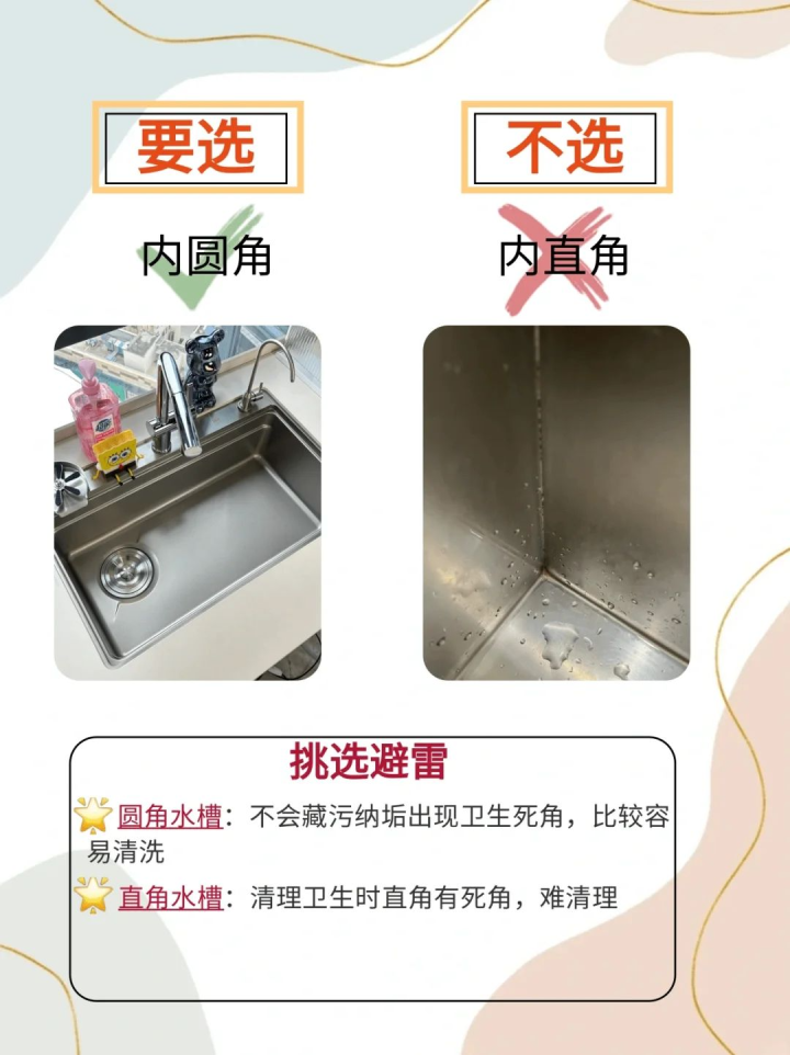大单槽更实用,双槽需谨慎尺寸不小于 65cm 的单槽,容量较大,能轻松容纳锅碗瓢盆。双槽往往空间受限,甚至放不下一口炒锅,使用起来不够便利。内角选小圆角,不选直角或大圆角直角内角容易形成卫生死角,清洁困难。圆角内角便于擦拭,其中小圆角多为手工槽,材质厚实不易开裂,可用空间也更大。深度至少 20cm,不选 18cm 以下水槽深度达到 20cm 及以上,不仅容量大,还能减少水流溅出,保持台面整洁。面板厚度不低于 3mm,避开 1-2mm面板厚度≥3mm 的水槽,质地厚实,承重能力强,不易变形,使用寿命更长。